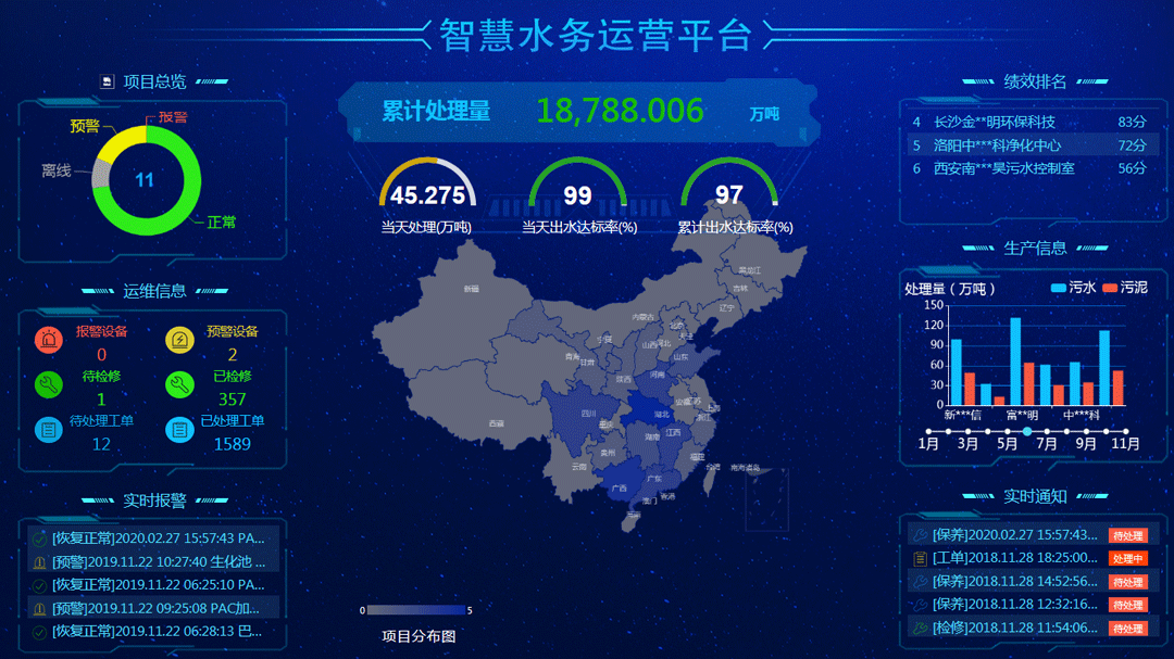 管理系统可对供水管路缺水、各电动机过载跳闸,都能在主画面“报警显示”区域自动用文本及声响方式报警,支持设备故障报警和上下限报警,能实时展示污水站告警信息、查询历史告警信息,并可设置告警消除规则。